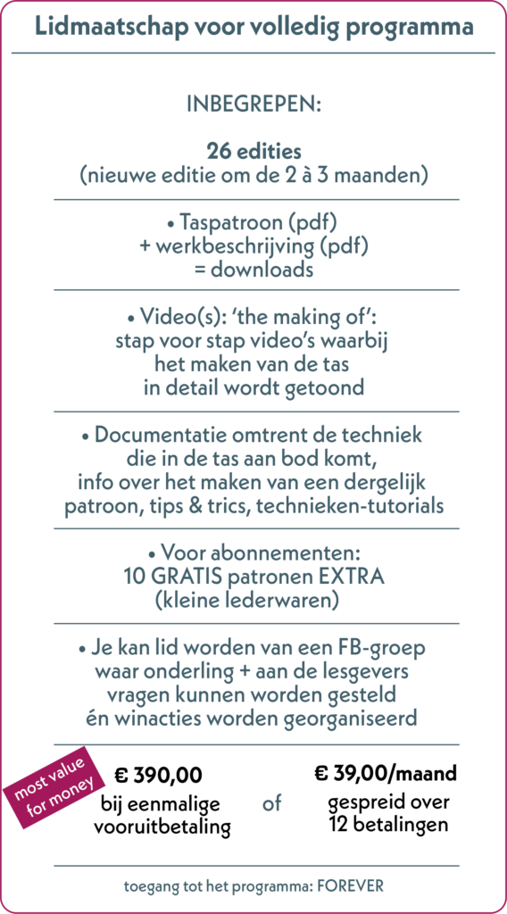 Proficiat! Je hebt ’the place to be’ gevonden om jouw passie voor de creatie van handtassen in leder ten volle te beleven en een niveau verder te tillen. Wil je een uitgebreid aanbod van patronen, tutorials over technieken, inzicht in de geheimen van patroontekenen voor tassen, een houvast en begeleiding in het maken van tassen met een waaier aan technieken? We gaan die honger van je nu stillen! Welkom!